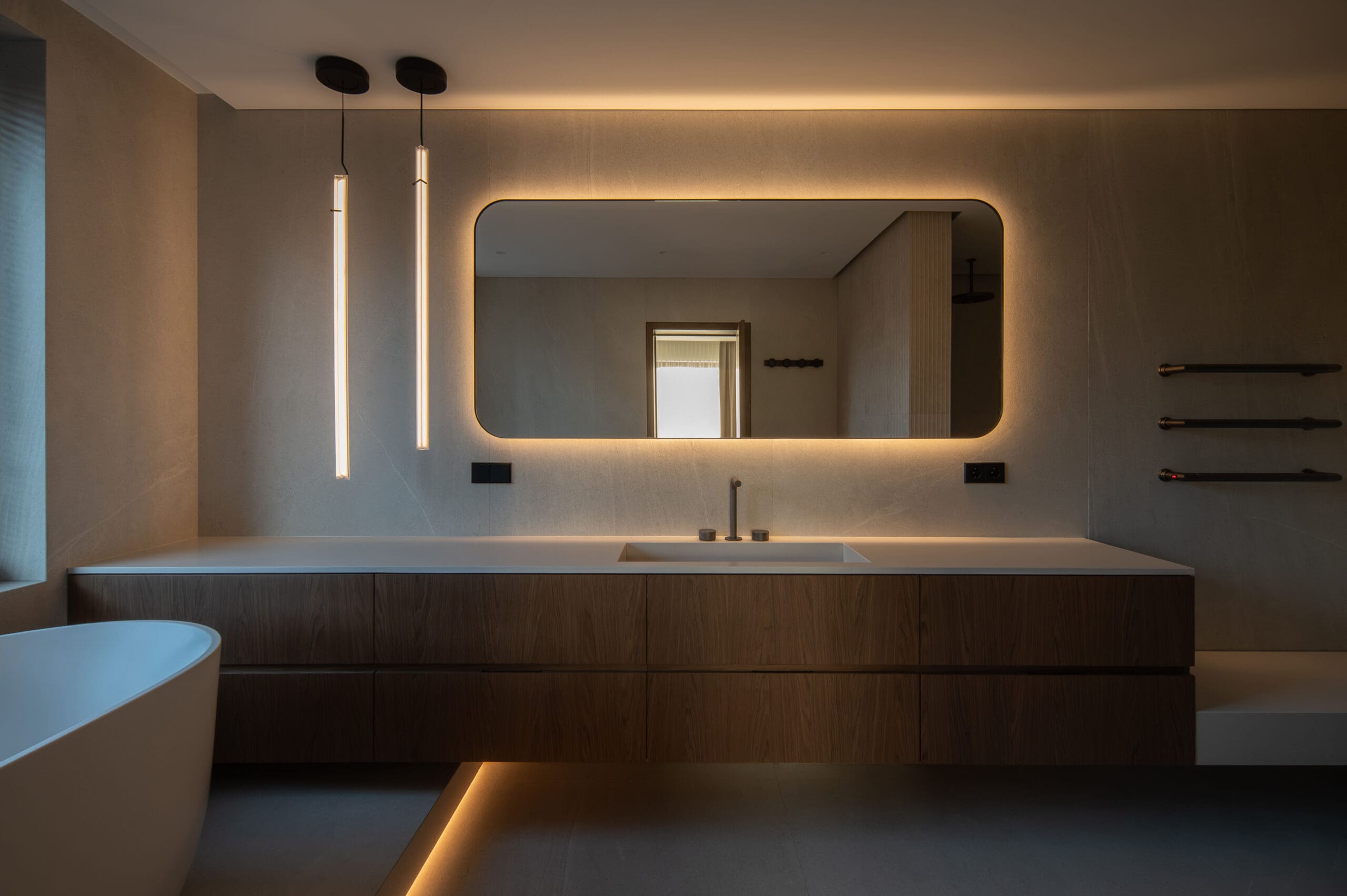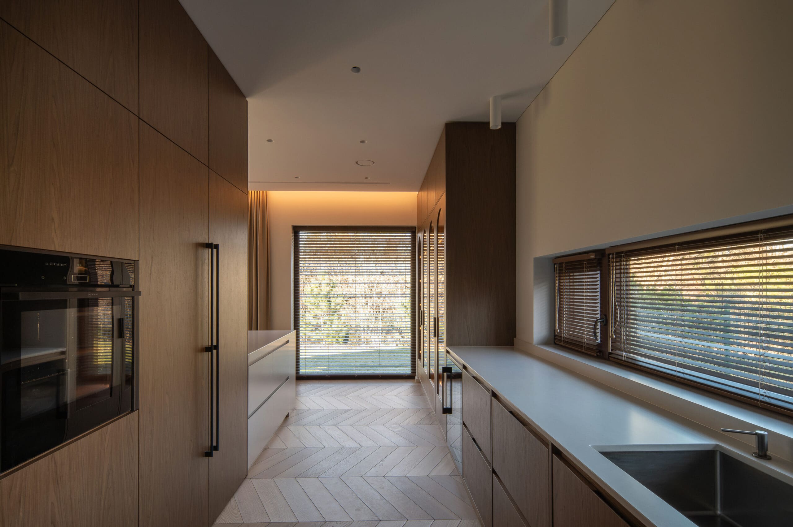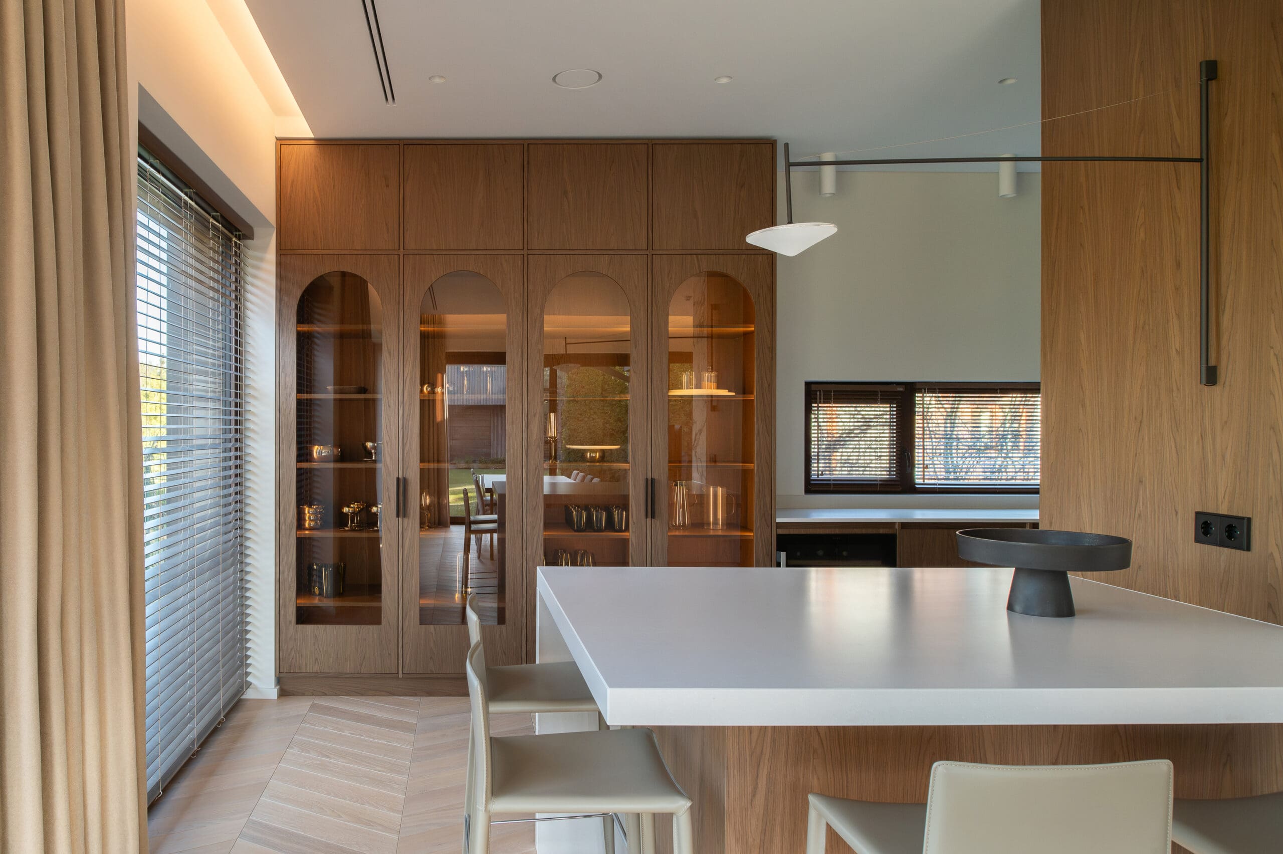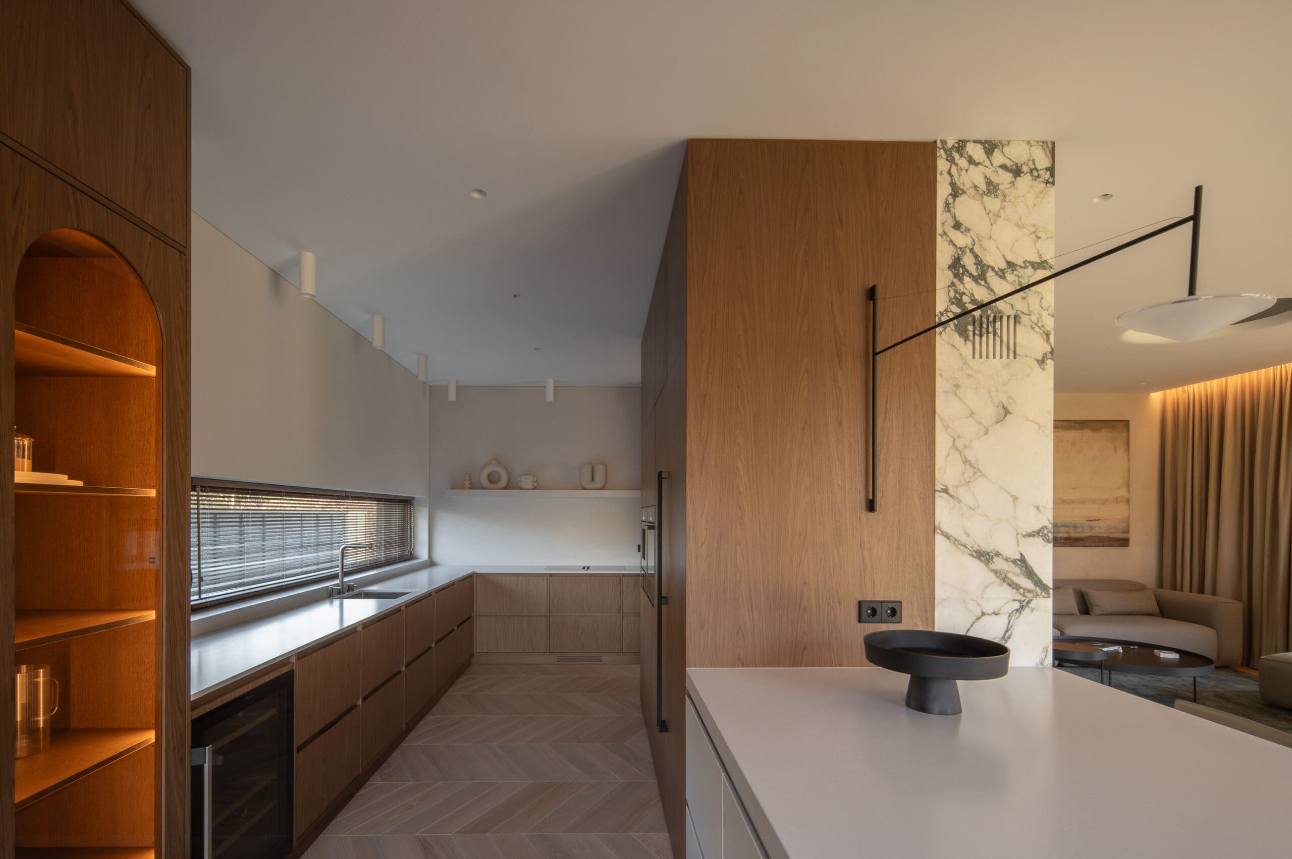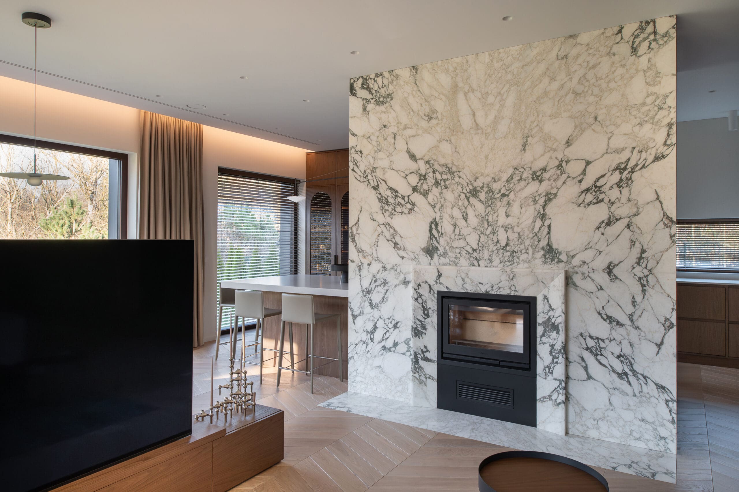 This modern interior is dominated by a harmony of natural stone and warm wood textures, creating a harmonious, subtly luxurious character of the living space. Stone is used as the main accent in the project - a particularly expressive marble wall with an integrated fireplace, which becomes the central element of the interior. The kitchen and living room areas are connected into a single, light-filled area, which maintains minimalism and functionality. Large-format stone panels allow for a seamless pattern and emphasize the aesthetics of the natural material. The same stylistic direction is continued in the bathroom - surfaces in soft tones, integrated lighting and precisely processed stone are combined, giving the space coziness and modern elegance. The project is distinguished by carefully thought-out details, high quality of processing and durable solutions that ensure both aesthetics and functionality for everyday use.